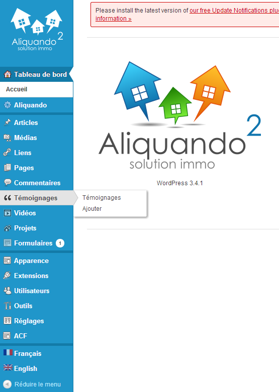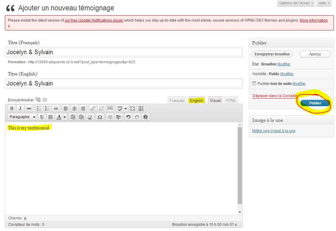 3. Cliquez sur l'onglet English et ajouter le texte anglais dans la boite appropriée et cliquez sur Publier dans le menu de droite.