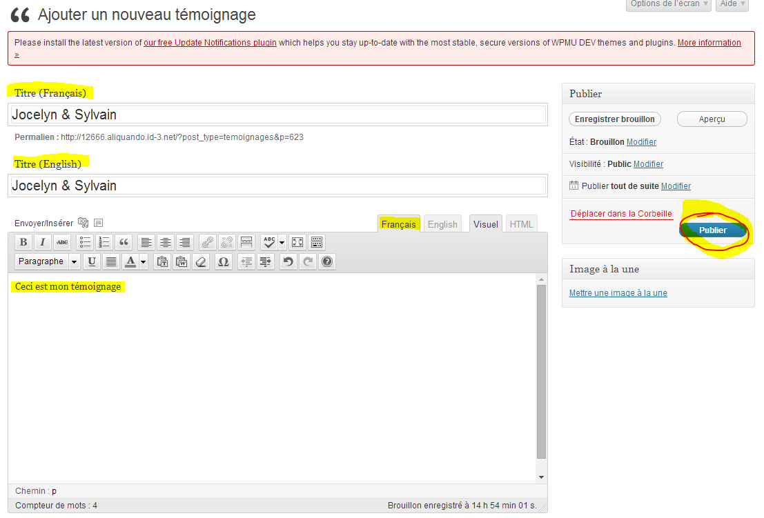 2. Ajouter un titre (nom de la personne) en francais ainsi qu'en anglais. Ajouter le texte français dans la boite appropriée et cliquez sur Publier dans le menu de droite. Notez que si vous ne cliquez pas sur Publier avant de passer à l'autre étape, les infos ne seront pas sauvegarder.