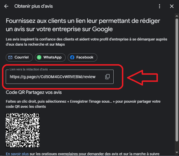 3- Repérer ce lien, celui-ci amène directement au pop-up pour laisser un avis. Copier-coller le pour le partager.